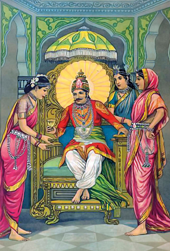 (An oleograph by Raja Ravi Verma, of the scene of Dasharatha offering the payasam to his three wives.)